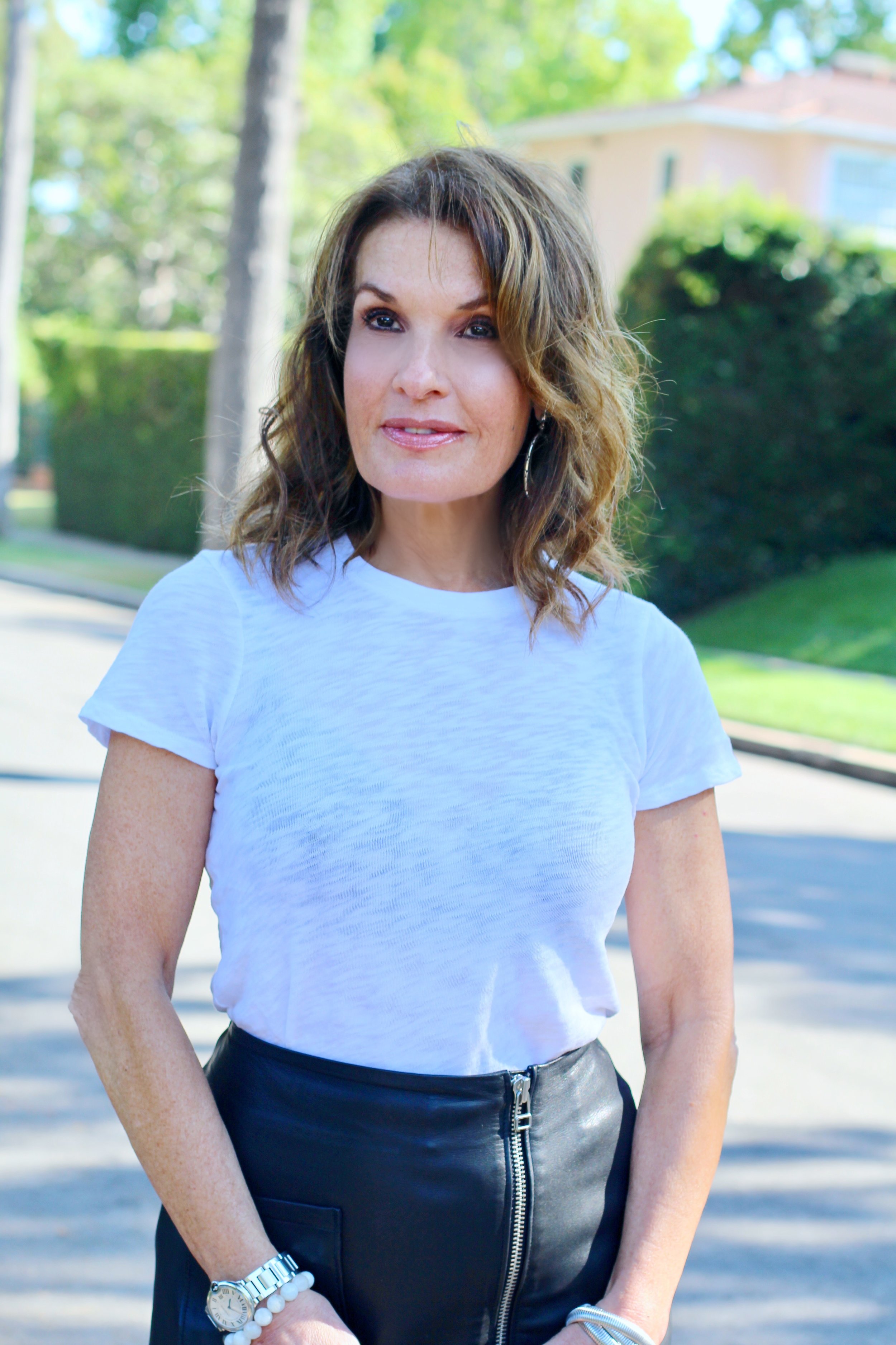 ATM T-shirt, Tiger of Sweden Skirt, Maui Jim Sunglasses, Tabitha Simmons Shoes, Fendi Handbag, Spinelli Kilcollin Ring, The Jewelry Bar Bracelets, John Hardy Earrings.