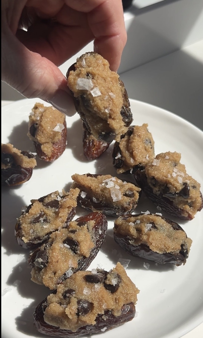 Gently open each pitted Medjool date and fill with a spoonful of the cookie dough mixture.